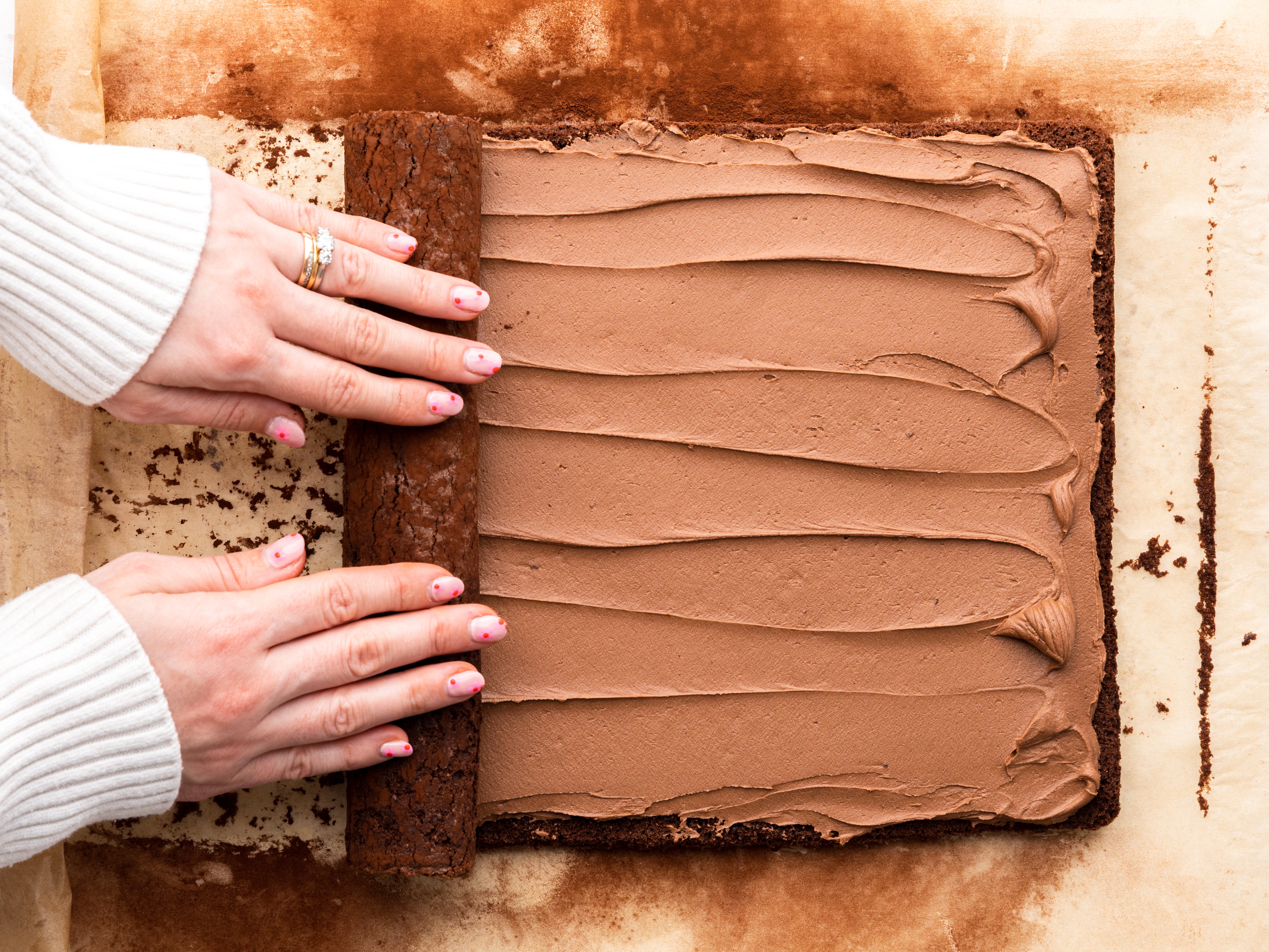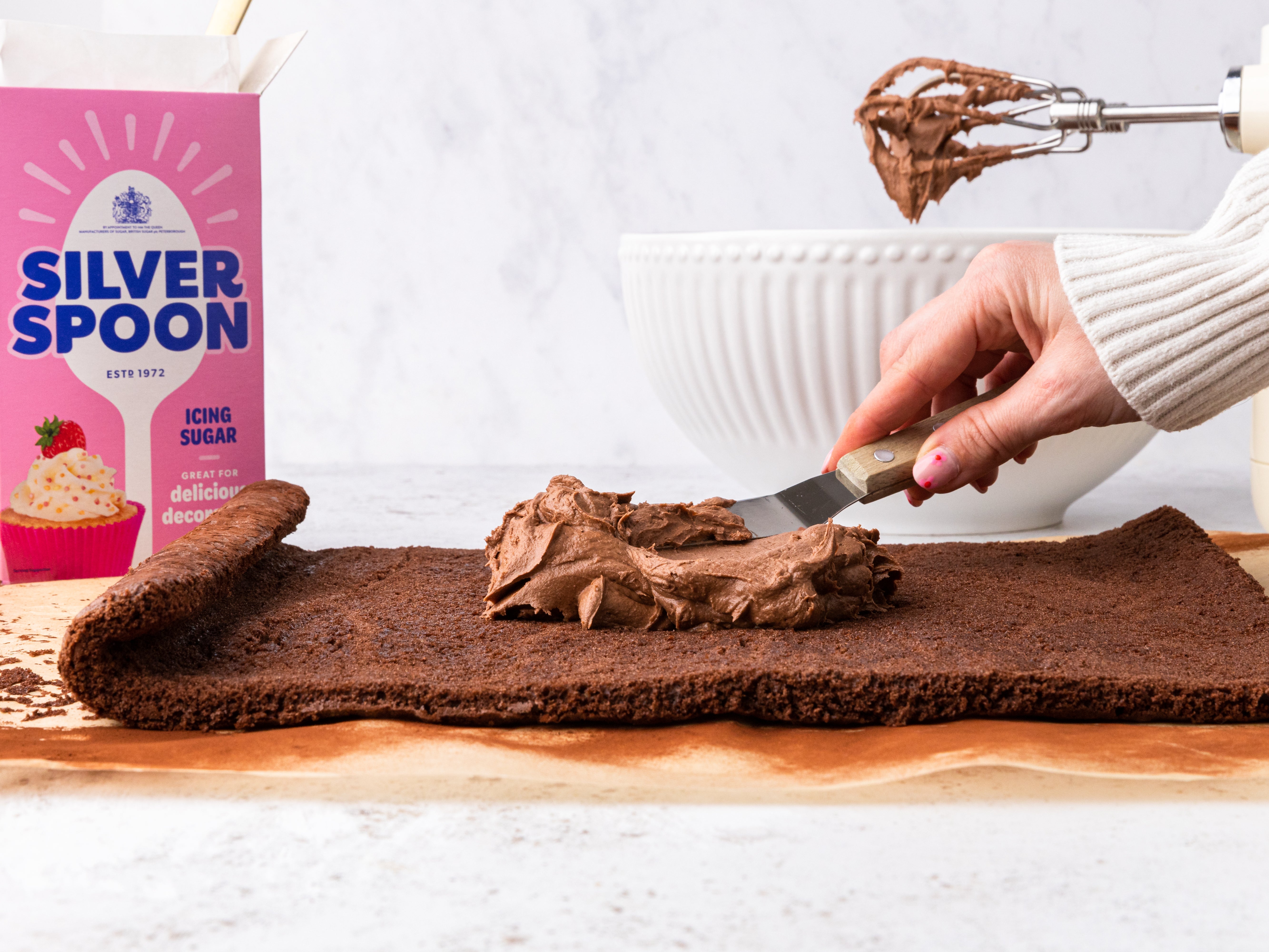 Unroll the sponge, spread over a generous layer of buttercream and roll up tightly again.