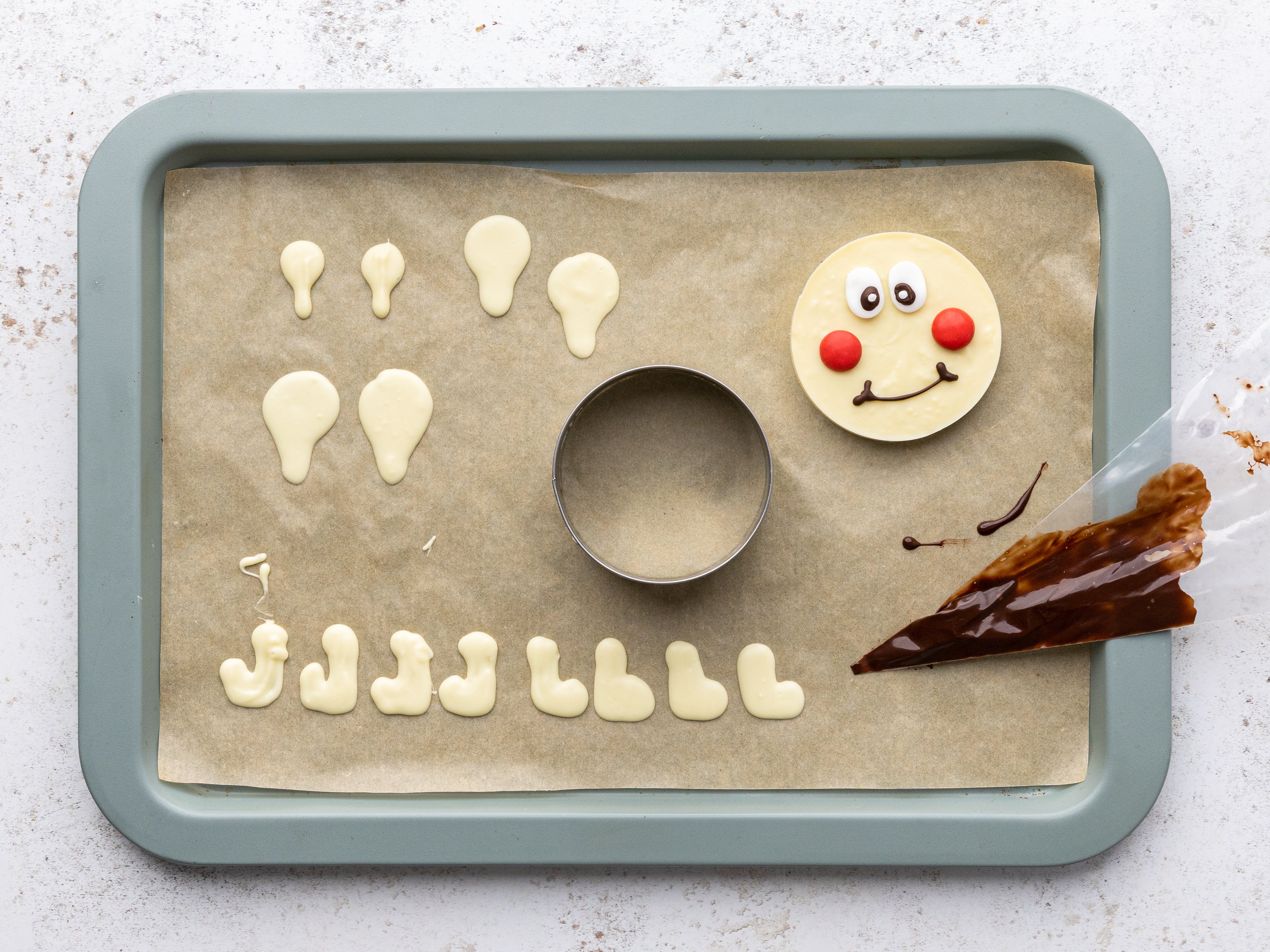 Place a 7cm round cookie cutter on the paper and fill with melted white chocolate. Gently shake the tray so the chocolate levels out. Add two red Smarties for the rosy cheeks.
