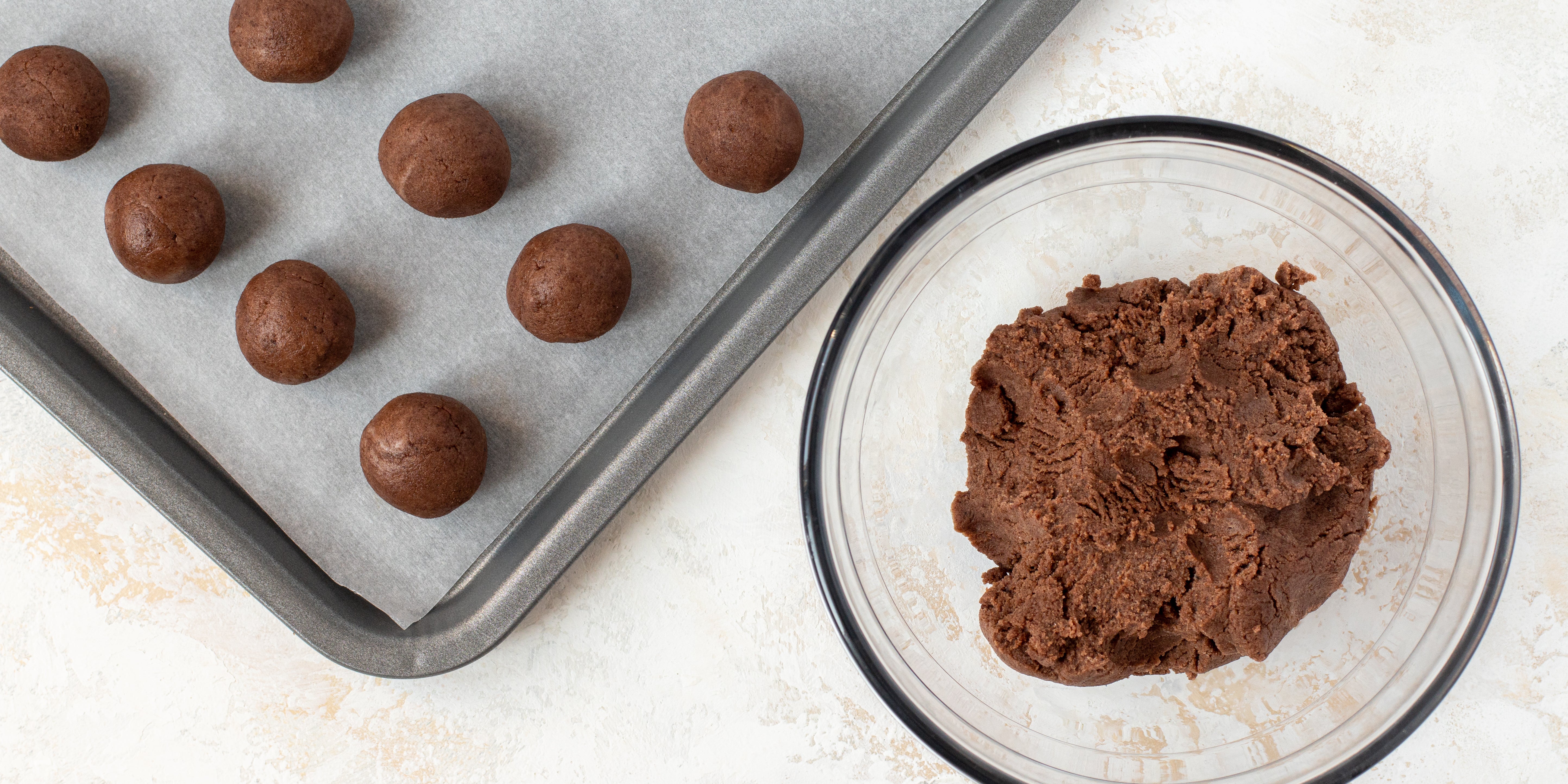 Make balls of the mixture by rolling between your hands and place on a baking tray. Place these in the fridge to set for about 30 minutes. Next melt your dark chocolate and white chocolate in separate bowls.