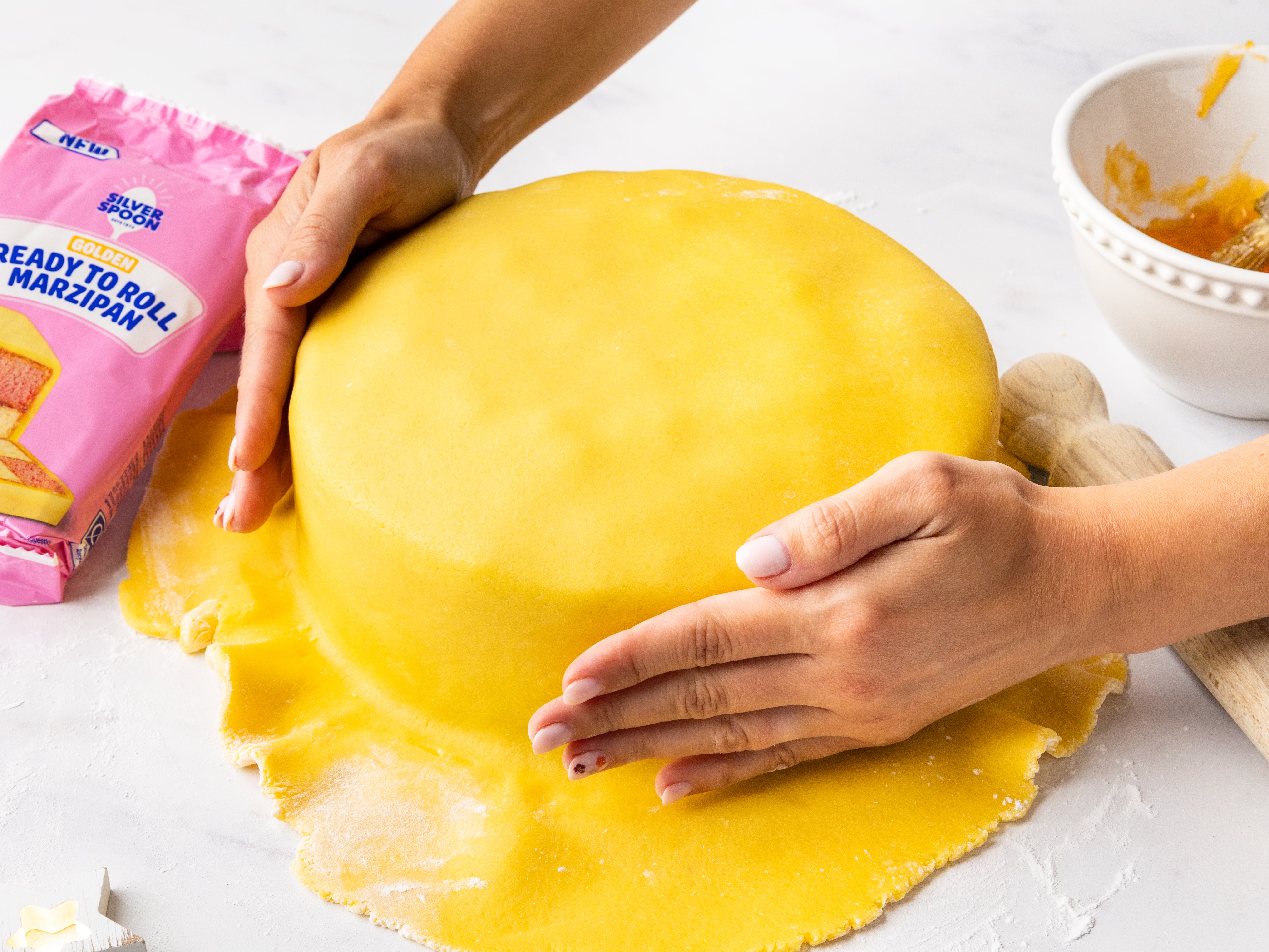 - Roll out marzipan: Dust your surface with Silver Spoon icing sugar and roll out the Silver Spoon ready to roll golden marzipan to cover the cake smoothly.