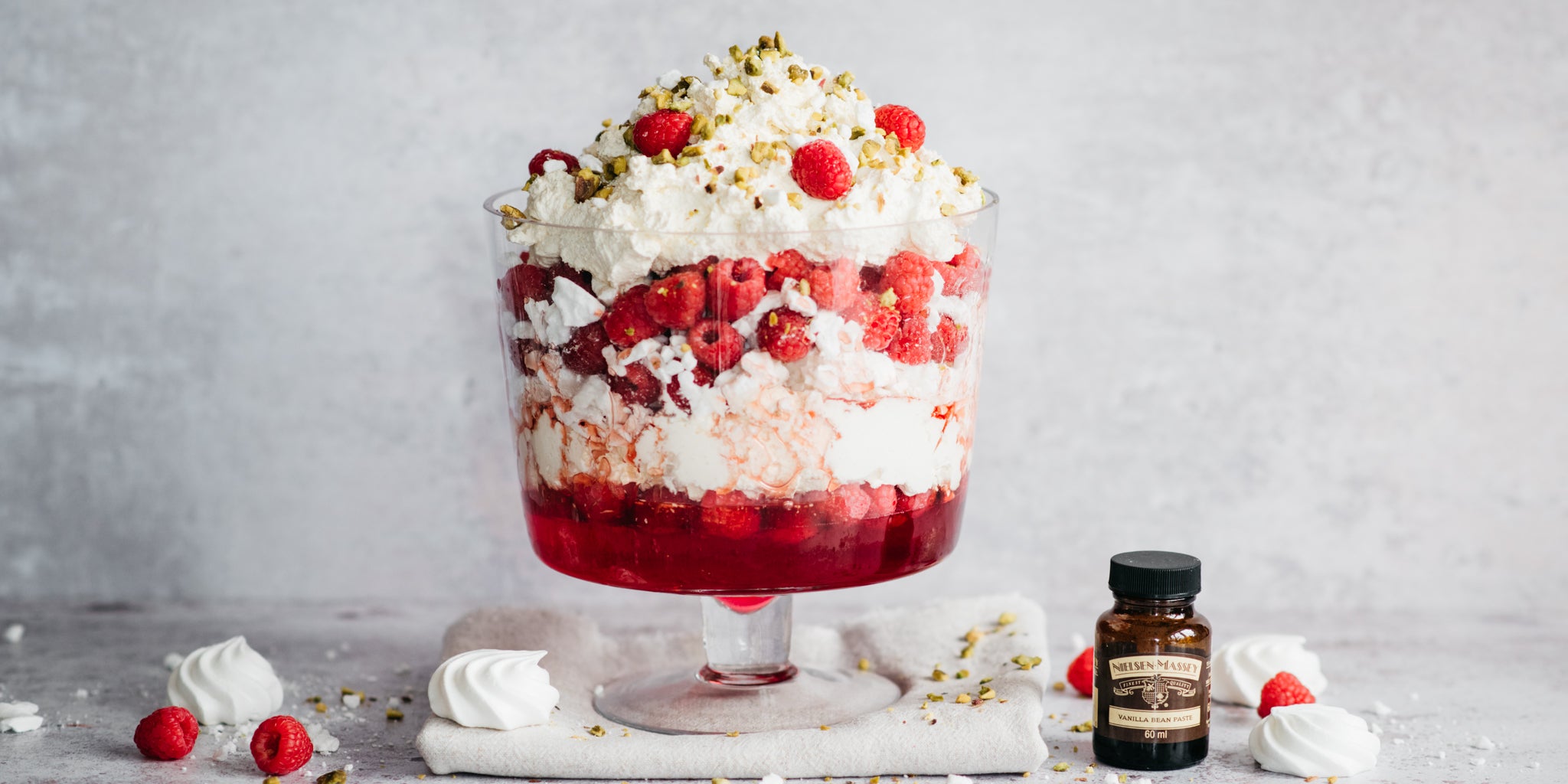 Layers of homemade raspberry jelly, with crunchy golden meringue, vanilla-infused cream, fresh raspberries and topped with a sprinkling of pistachios. This is the ideal pudding to use up those fresh summer raspberries.