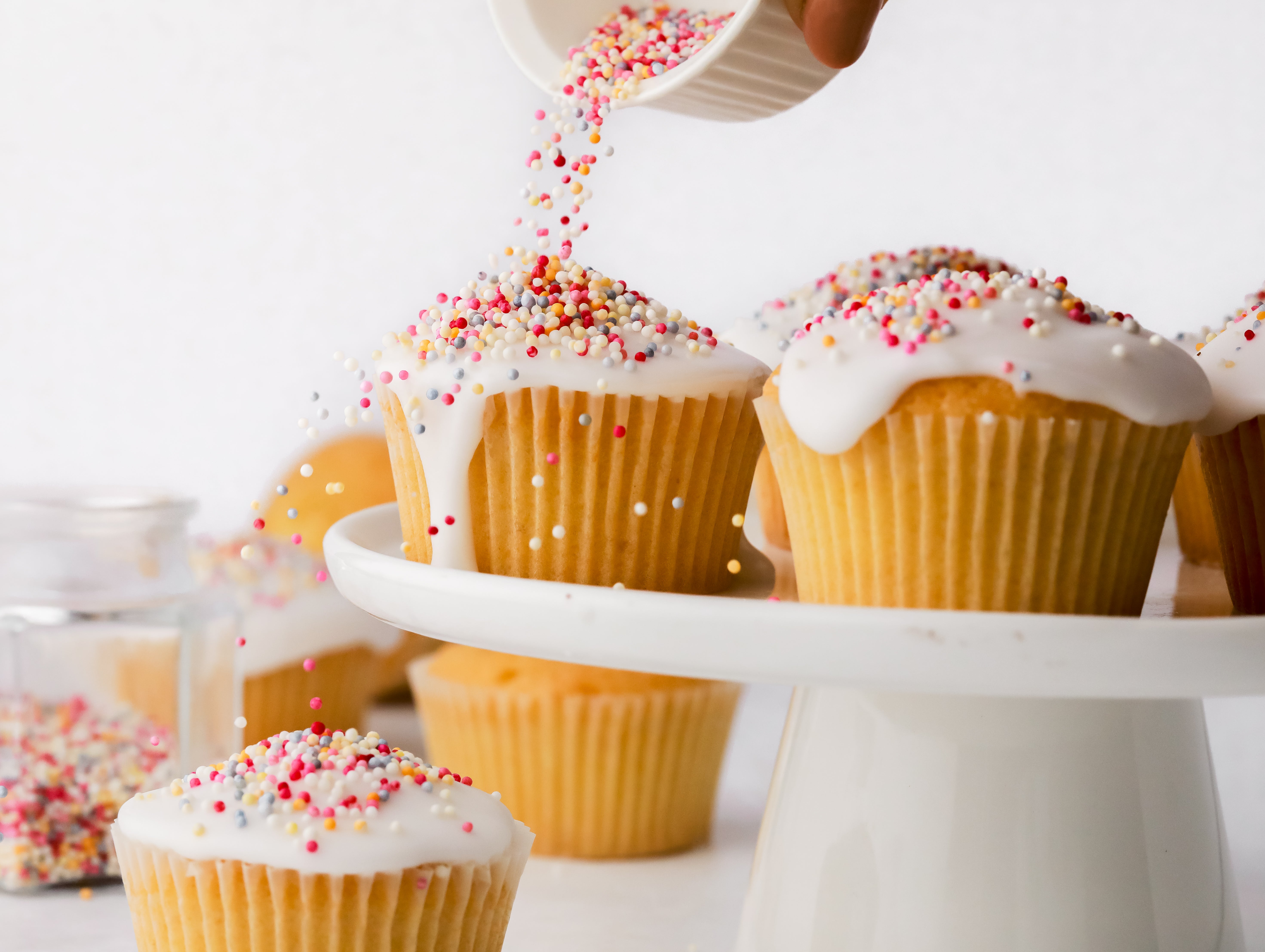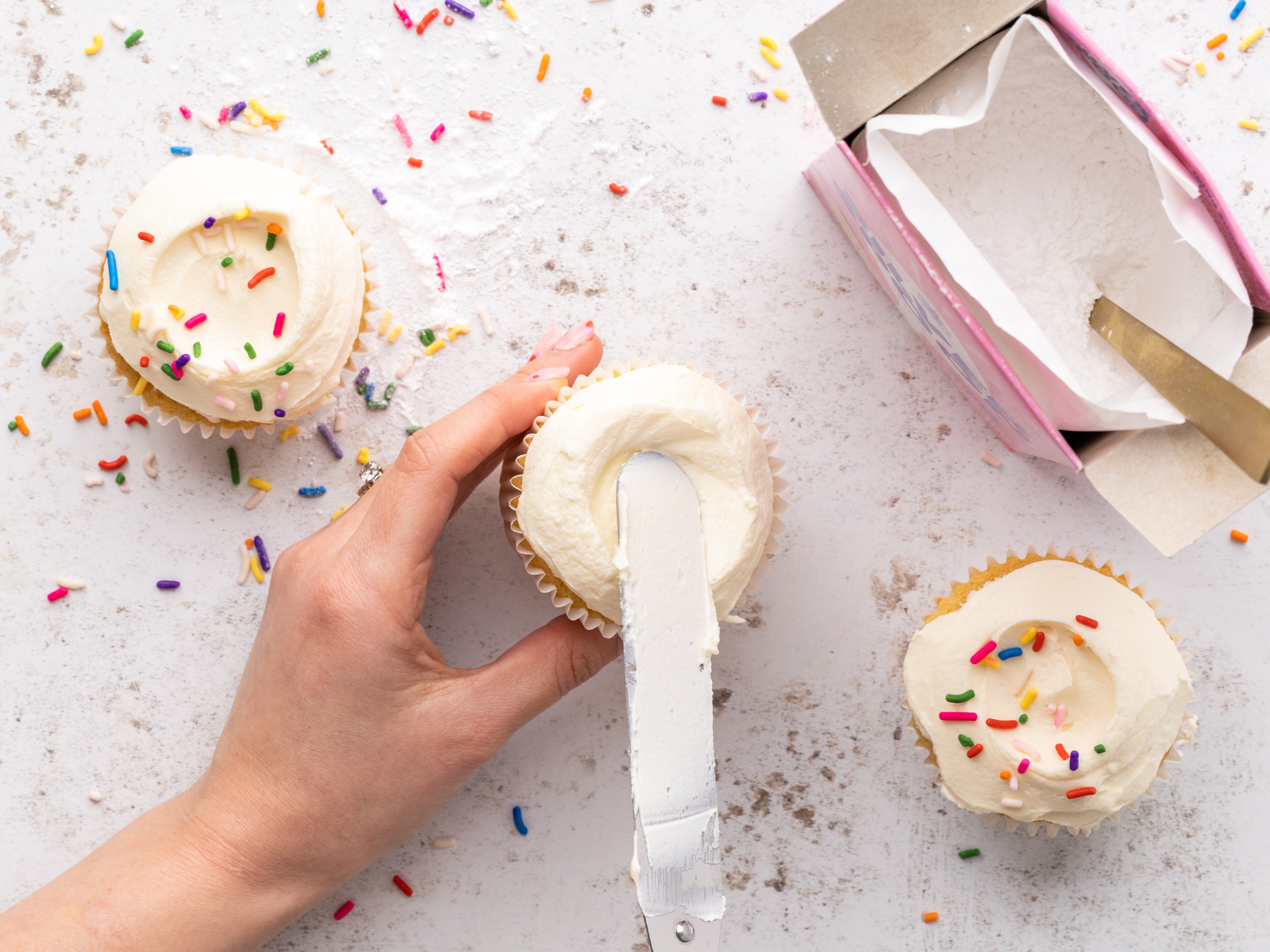Spoon the icing on to each cake and decorate with a handful of coloured sprinkles.