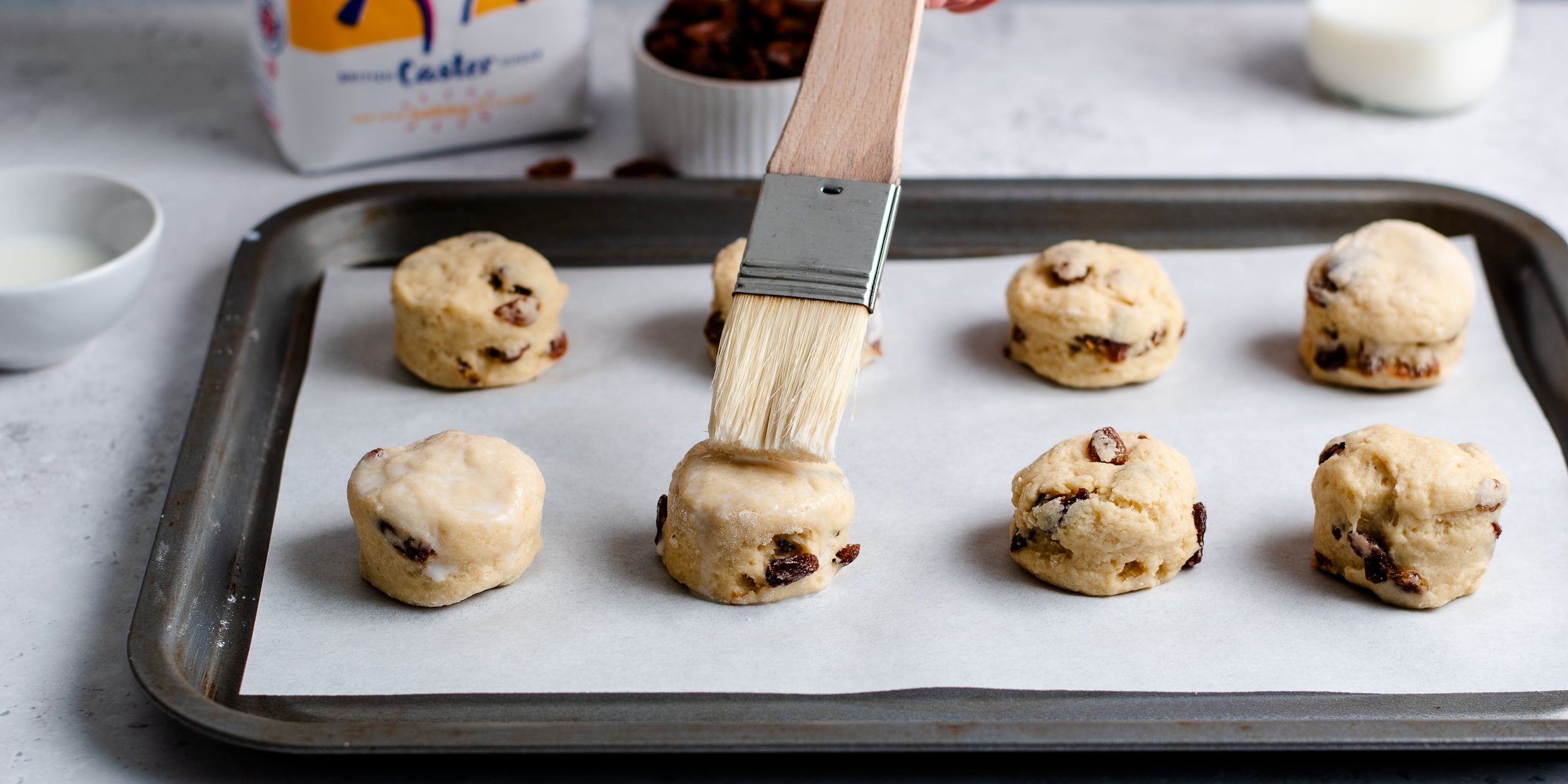Place these on the baking tray, leaving about 5cm space in between, brush the tops with a little milk then bake in the oven for 15-20 minutes until they are golden brown and risen.