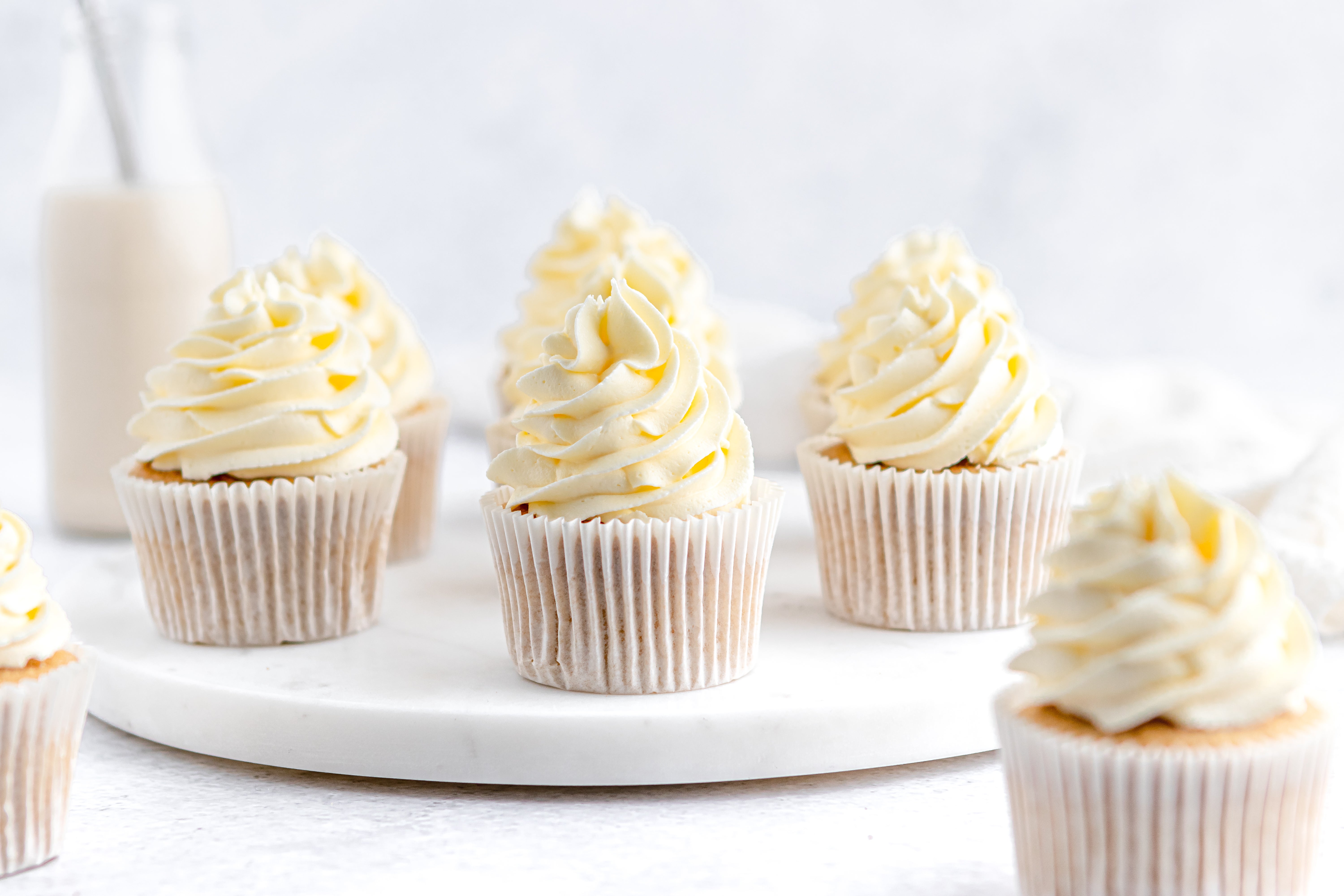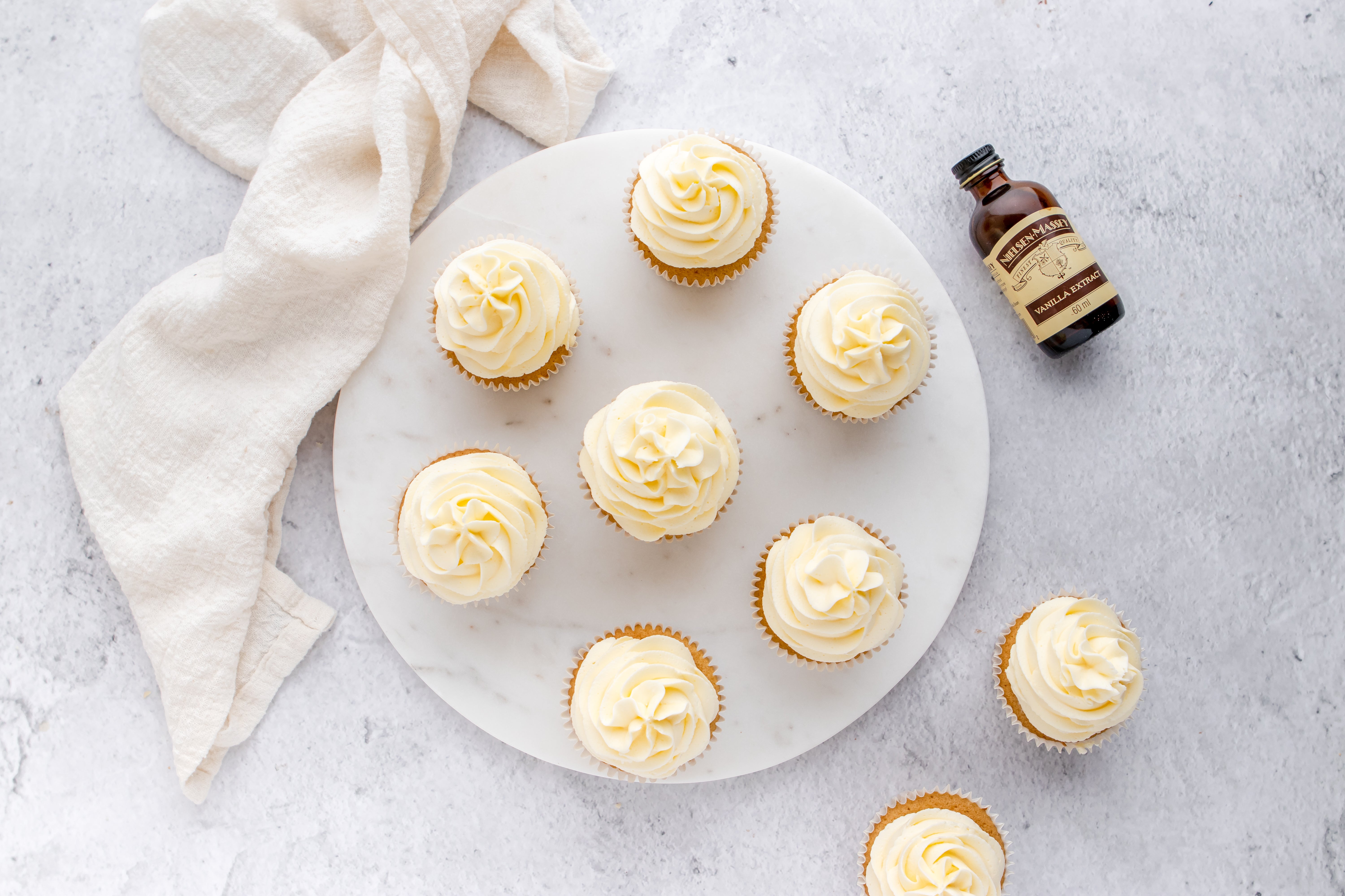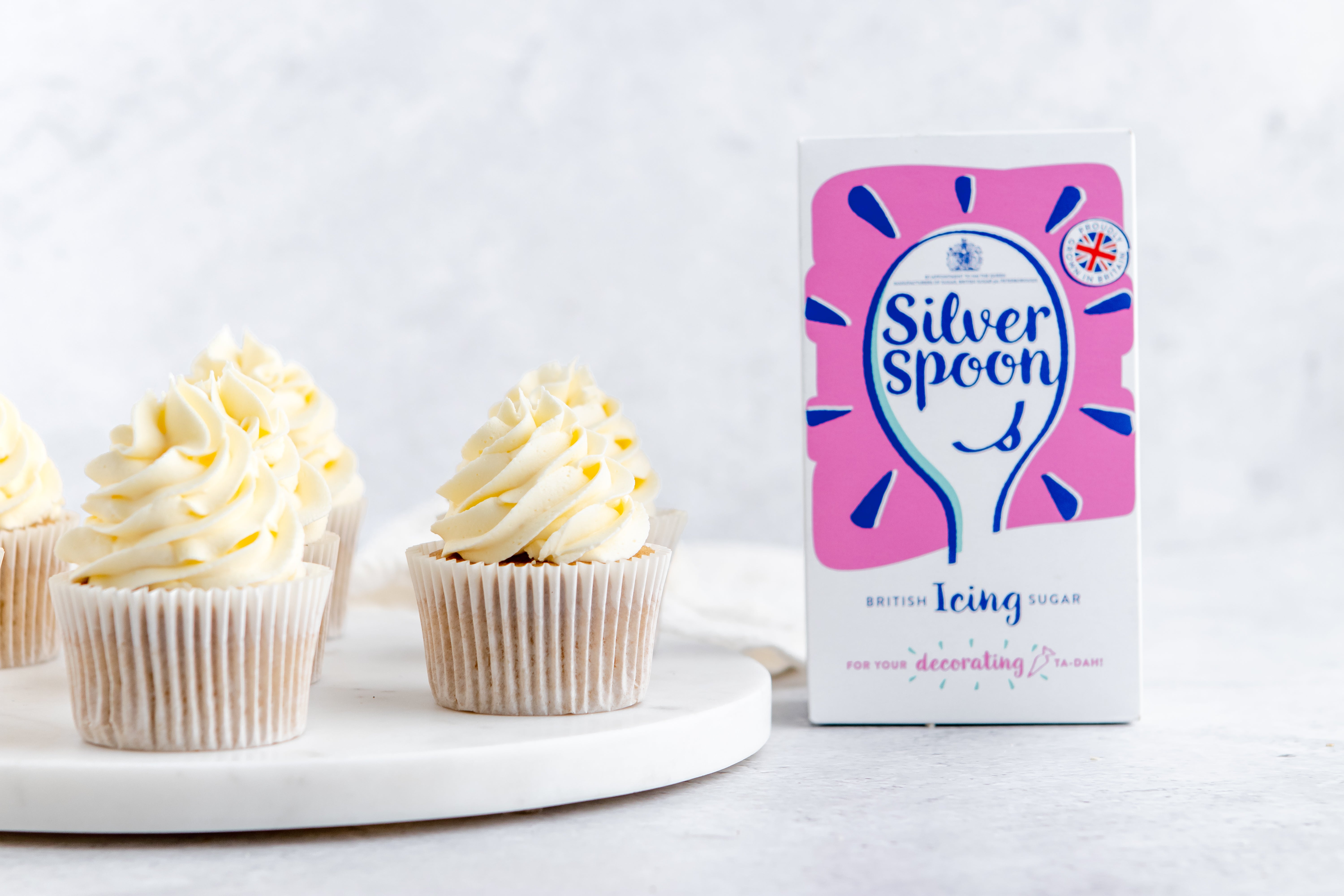 To make the buttercream, beat together the butter and icing sugar in an electric mixer, until smooth. Add a few drops of vanilla extract for flavour, and a splash of milk if needed to loosen the icing. Fill a piping bag, fitted with a star nozzle with your buttercream and pipe onto your cupcakes to finish.