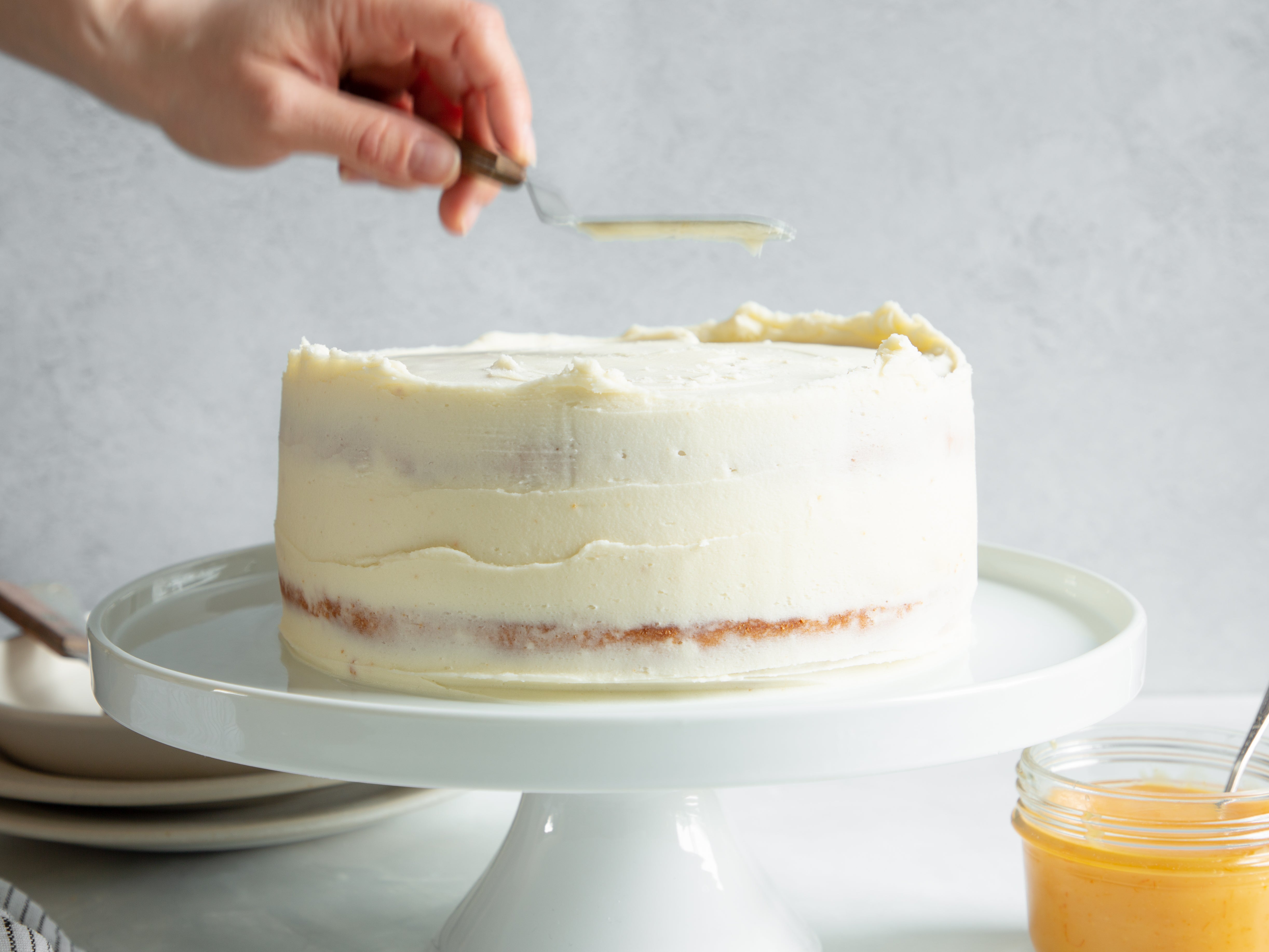 Choose which cake you'll add your lemon curd filling to, and check the top is level. If it's not, you can create a smooth surface by gently cutting the top with a knife so you have a flat surface to decorate. Spread the lemon curd onto the top of this cake. Then pipe or spread the buttercream onto the lemon curd layer before placing the other cake on top.