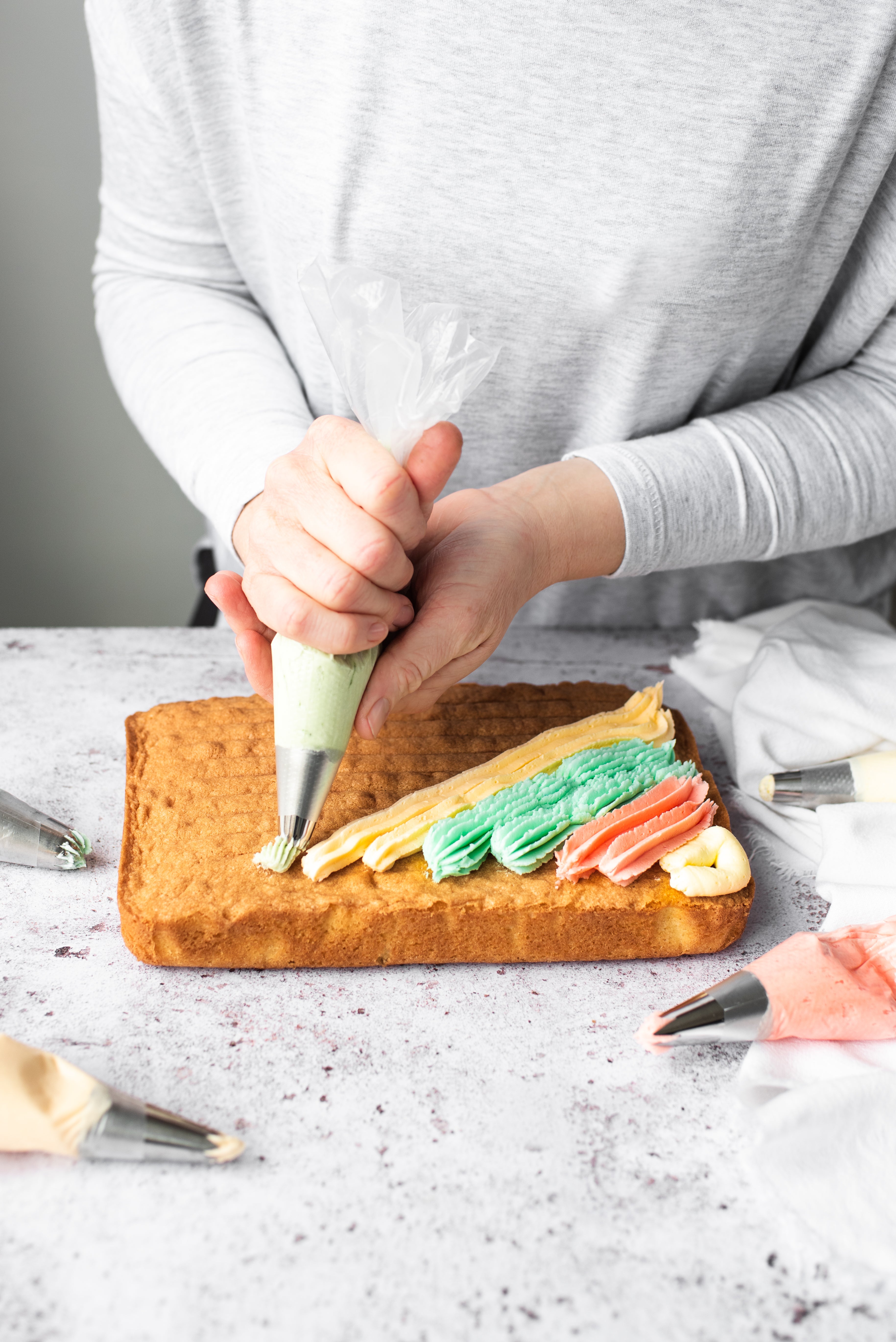 For each piping bag, use a large nozzle- it doesn't matter which shape they are, as the applied buttercream will be smoothed afterwards. Fill your piping bags: one for each colour. Using your first bag, pipe the corner of the cake to form a triangle. You want to aim for around an inch width for each colour.Use the piped triangle as a guide for where to start your next colour. Using your second colour, form a large stripe next to the triangle making sure it touches. Continue to do this, alternating all your colours until your cake is covered with buttercream stripes.