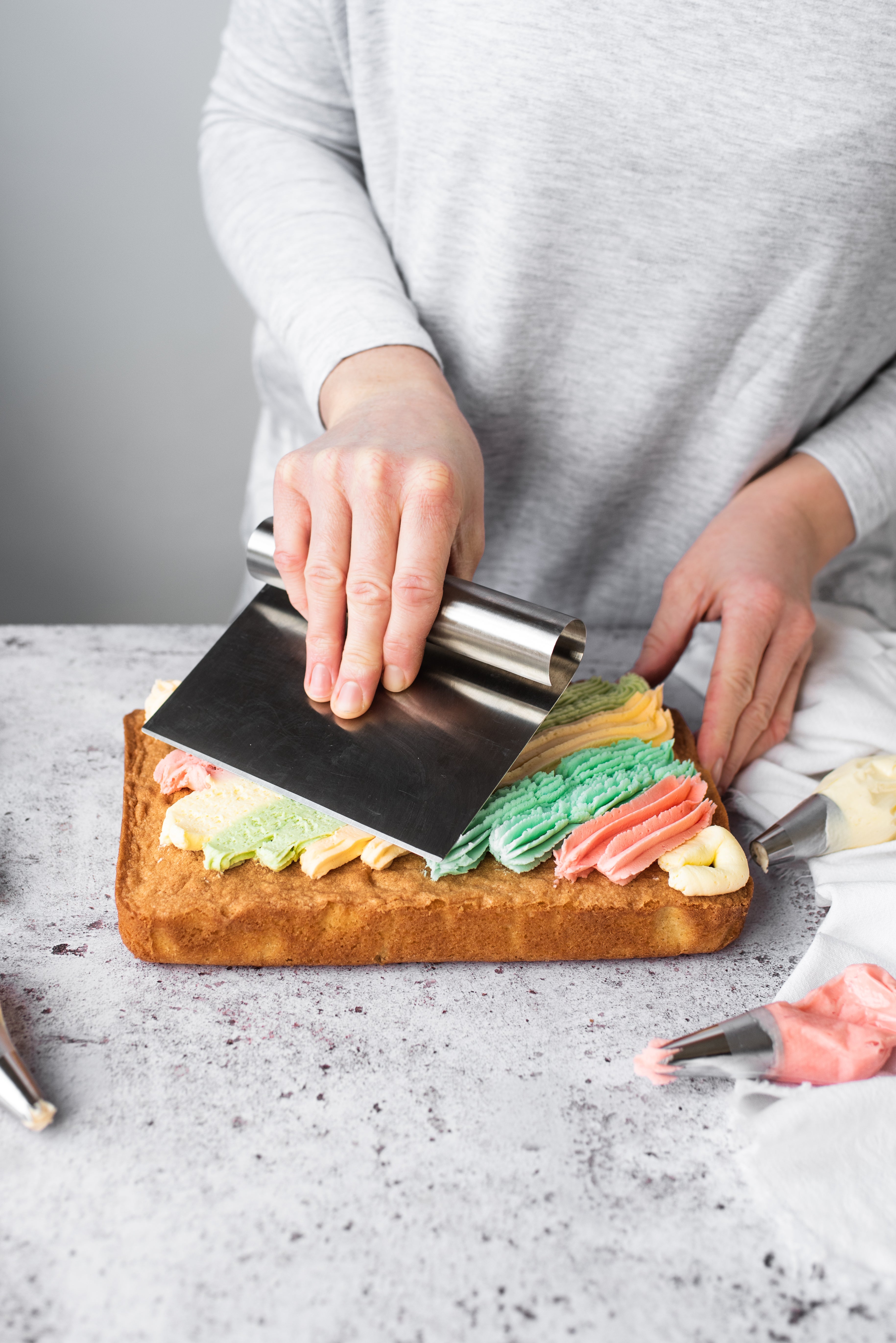 Use a cake smoother to blend the stripes into an overall covering. Make sure you follow the direction of the buttercream stripes so the colours don't bleed. Rinse and dry your smoother each time to stop the colours mixing.