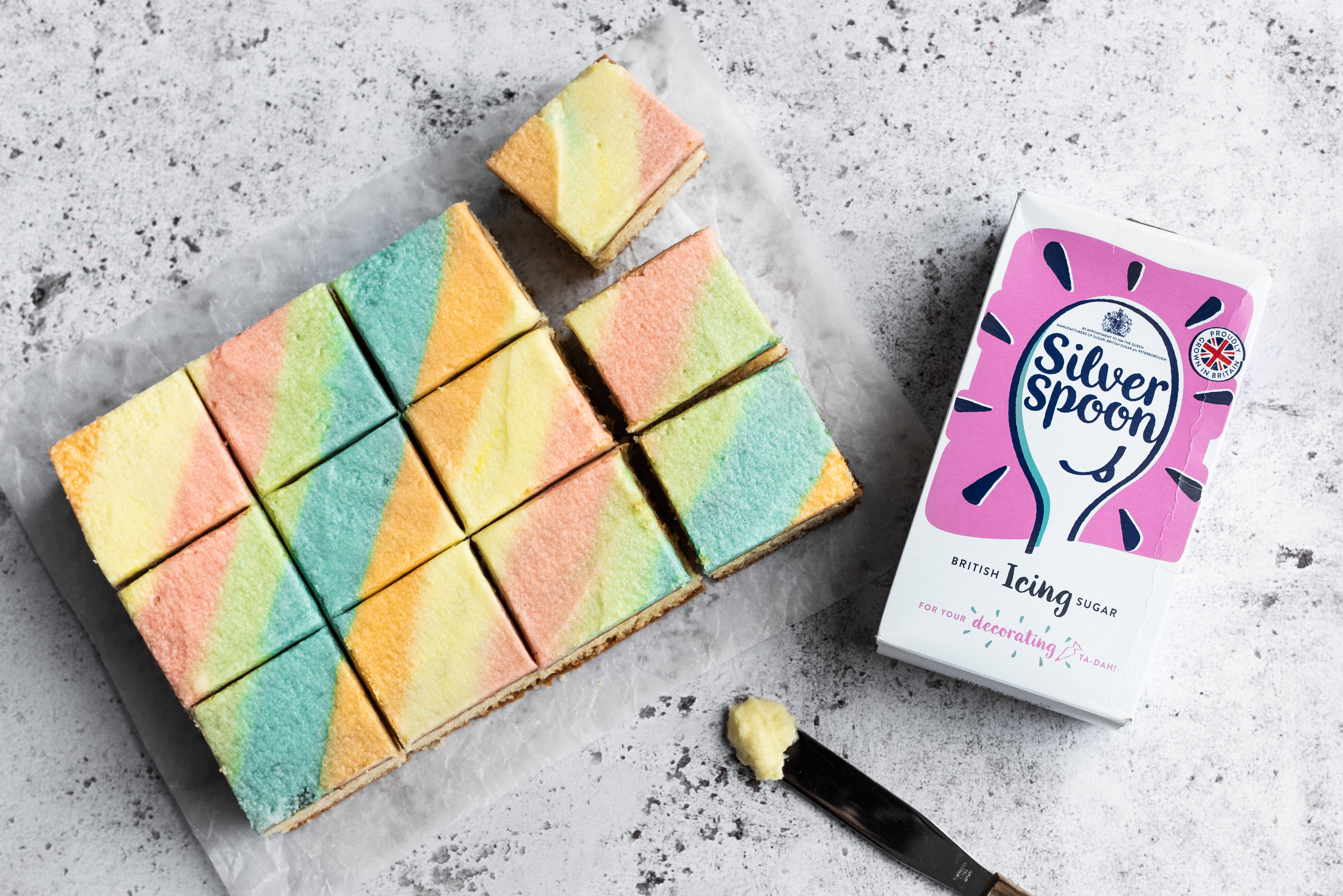 This rainbow sponge traybake recipe is a great time saver. It's for a simple traybake (or sometimes known as a sheetcake). This quick and easy traybake serves 12 and only takes 20 minutes to prepare. We've decorated ours with rainbow buttercream for a really fun look which the kids will love.