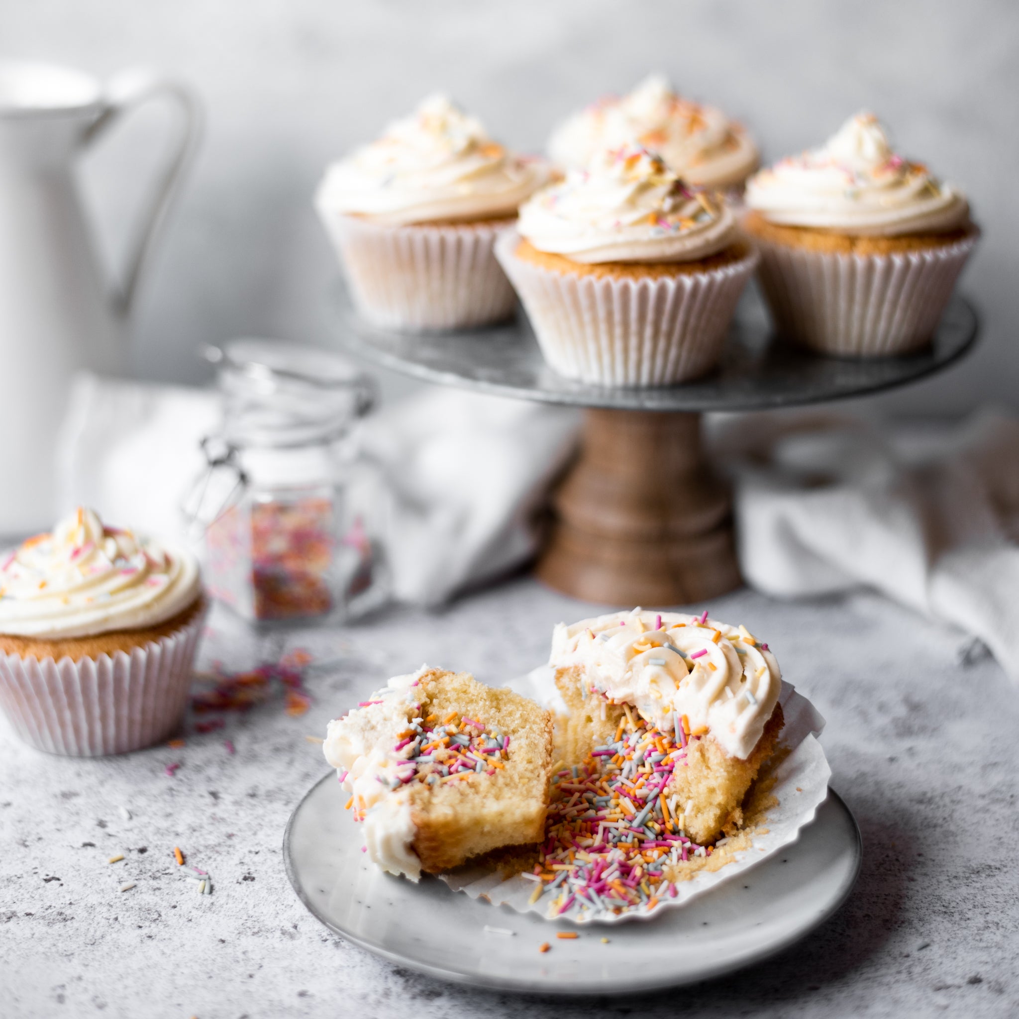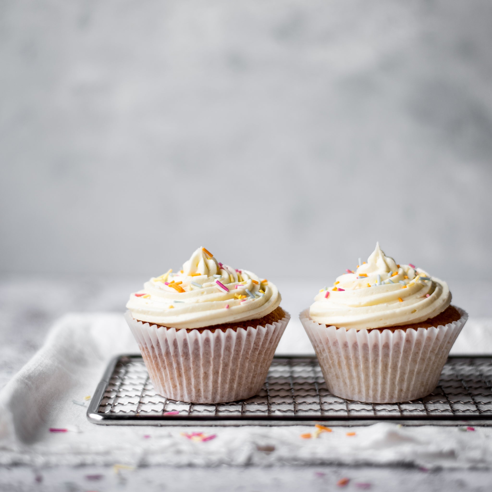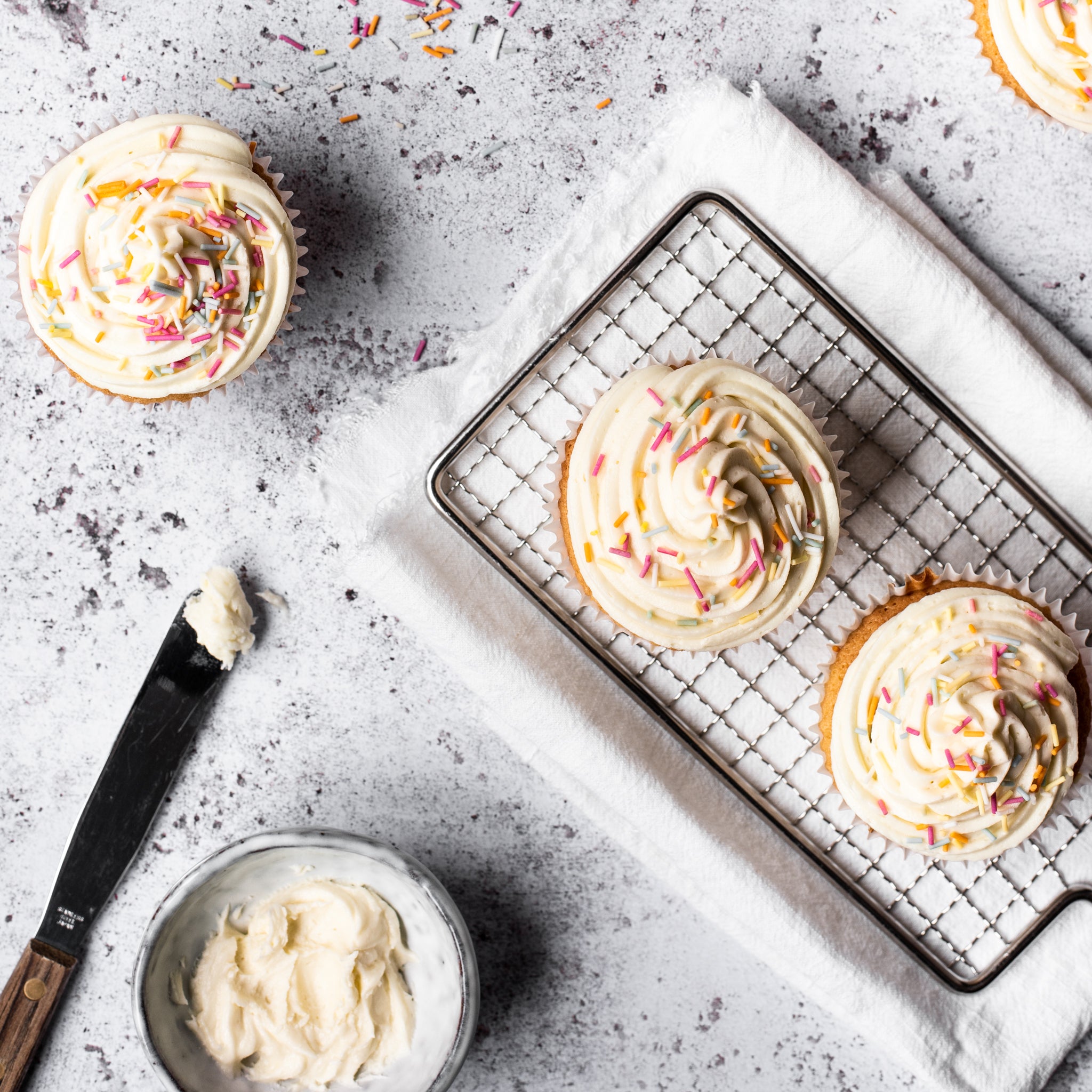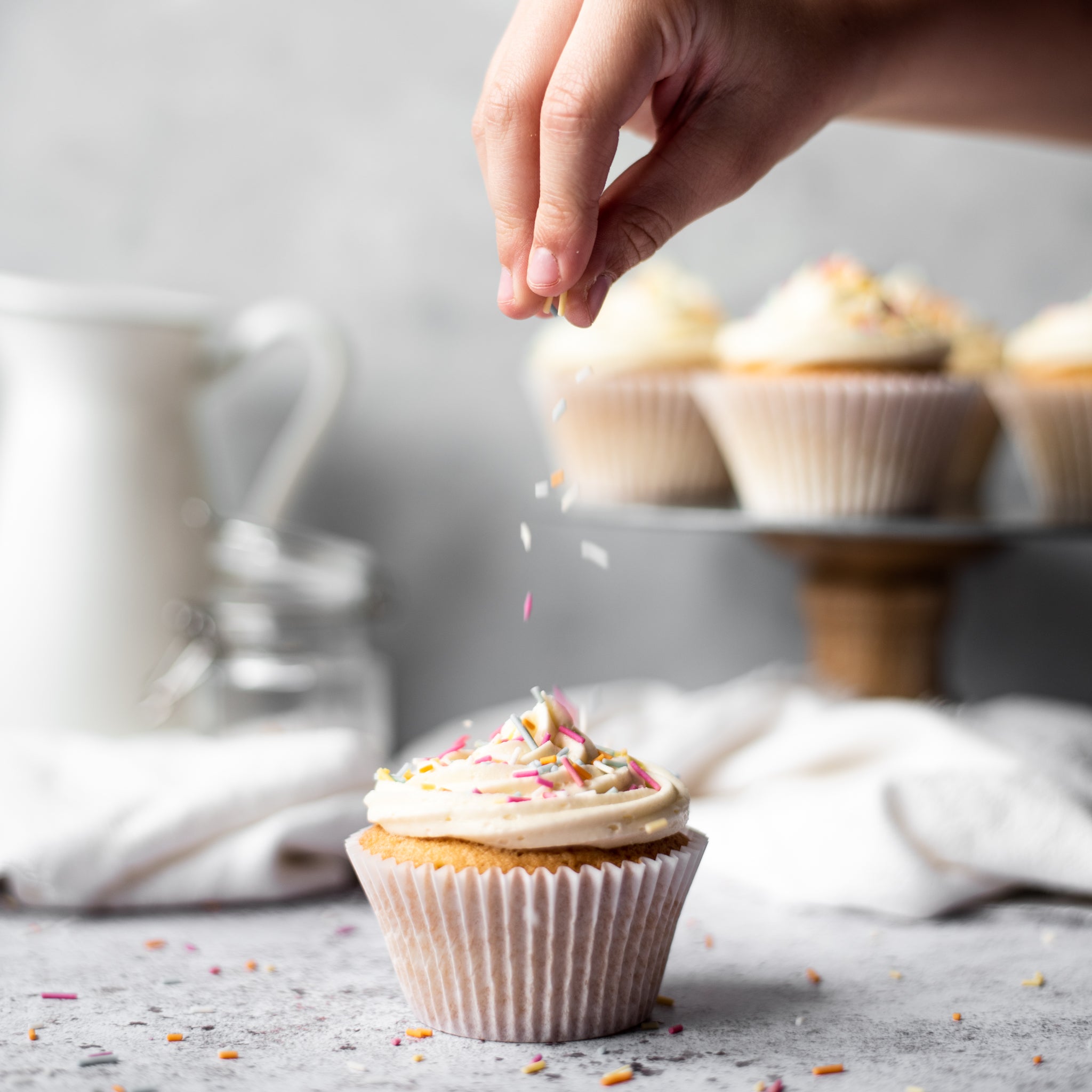 Finish by topping with a small amount of sprinkles on the buttercream and inserting cupcake toppers (if you wish).