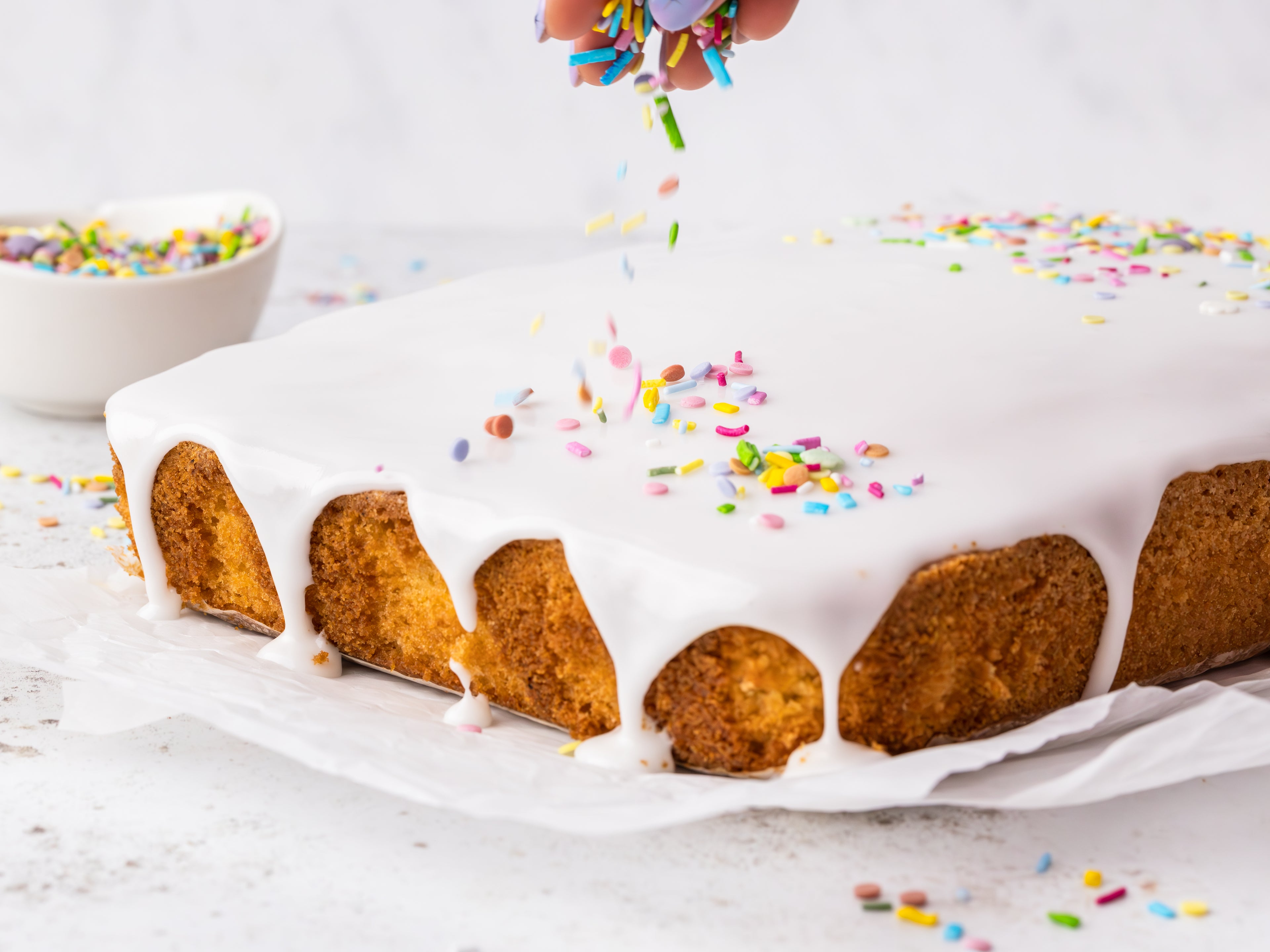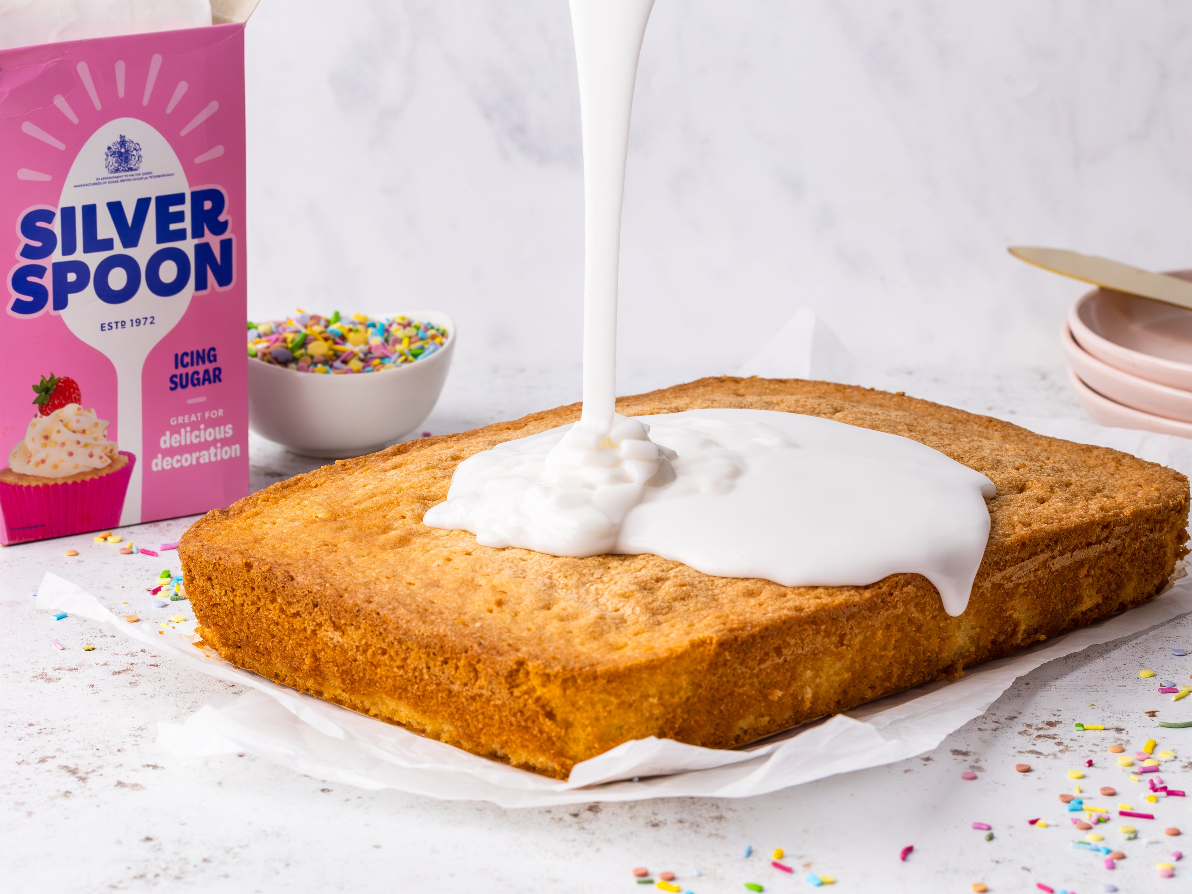 Pour the icing sugar on top of the cake, spreading it out evenly with a palette knife or the back of a spoon. Top generously with sprinkles before letting it set for at least 20 minutes. Slice up into squares to serve.