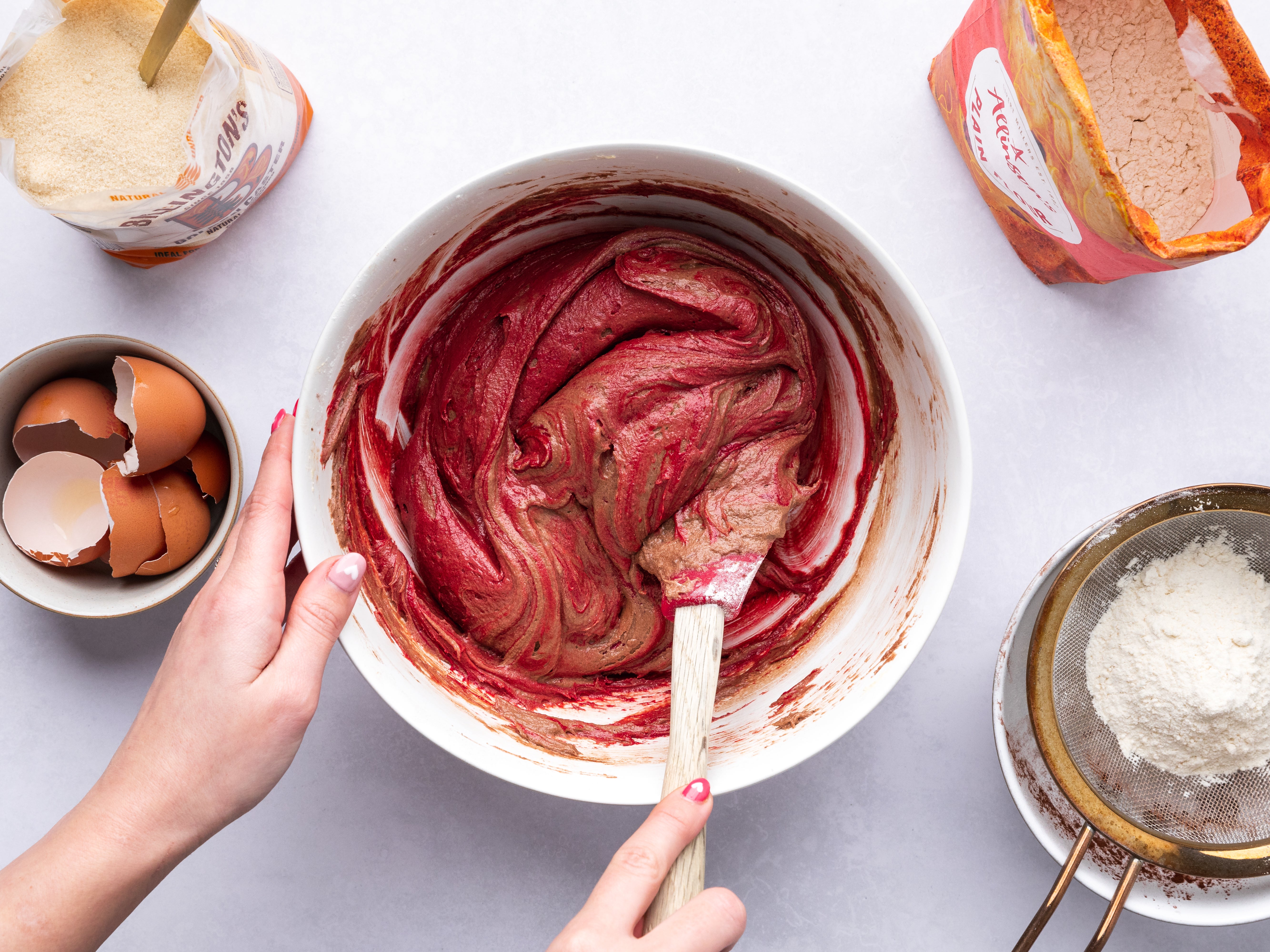 Sift in the flour, cocoa and baking powder and carefully fold in until just incorporated, do not over mix. Then add the red colour and carefully mix until distributed evenly through the batter.