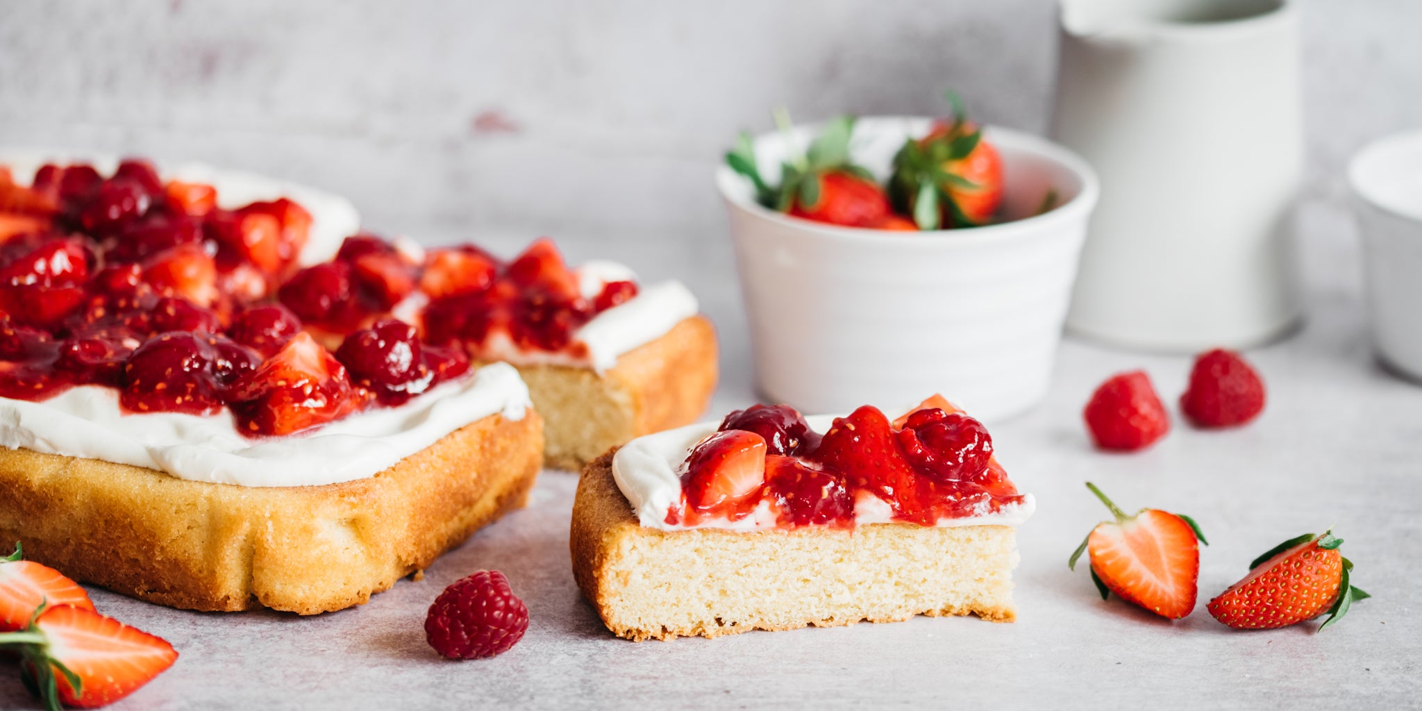 Spoon the cream over the cake, using the back of spoon to swoosh it over. Top with the strawberries and raspberries. Finish with a dusting of icing and then slice into squares to serve.