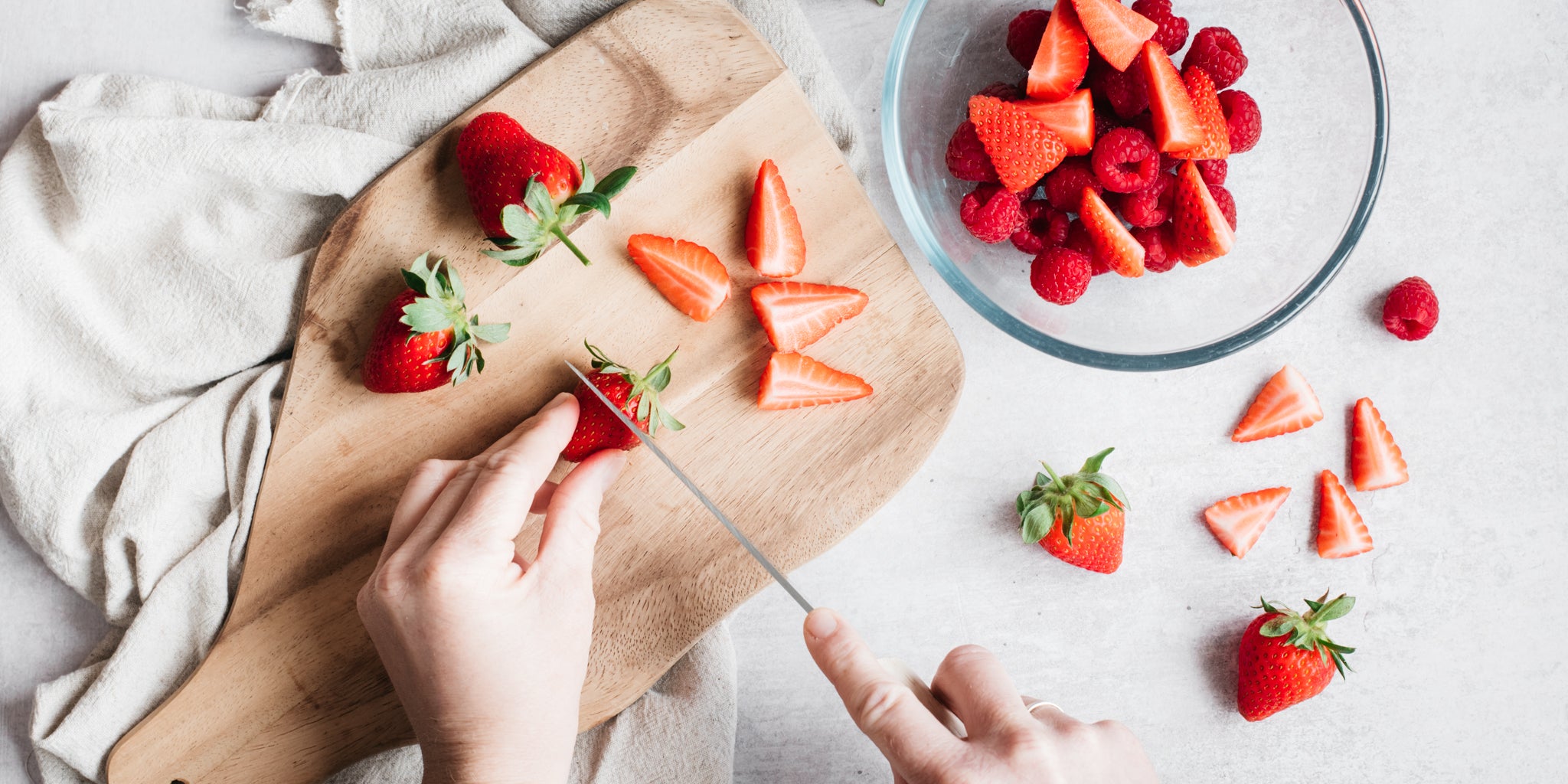 Whilst the cake cools, remove the tops from the strawberries and cut into quarters. Add to a bowl with the raspberries. Dust the icing sugar over the top, stir and set aside.