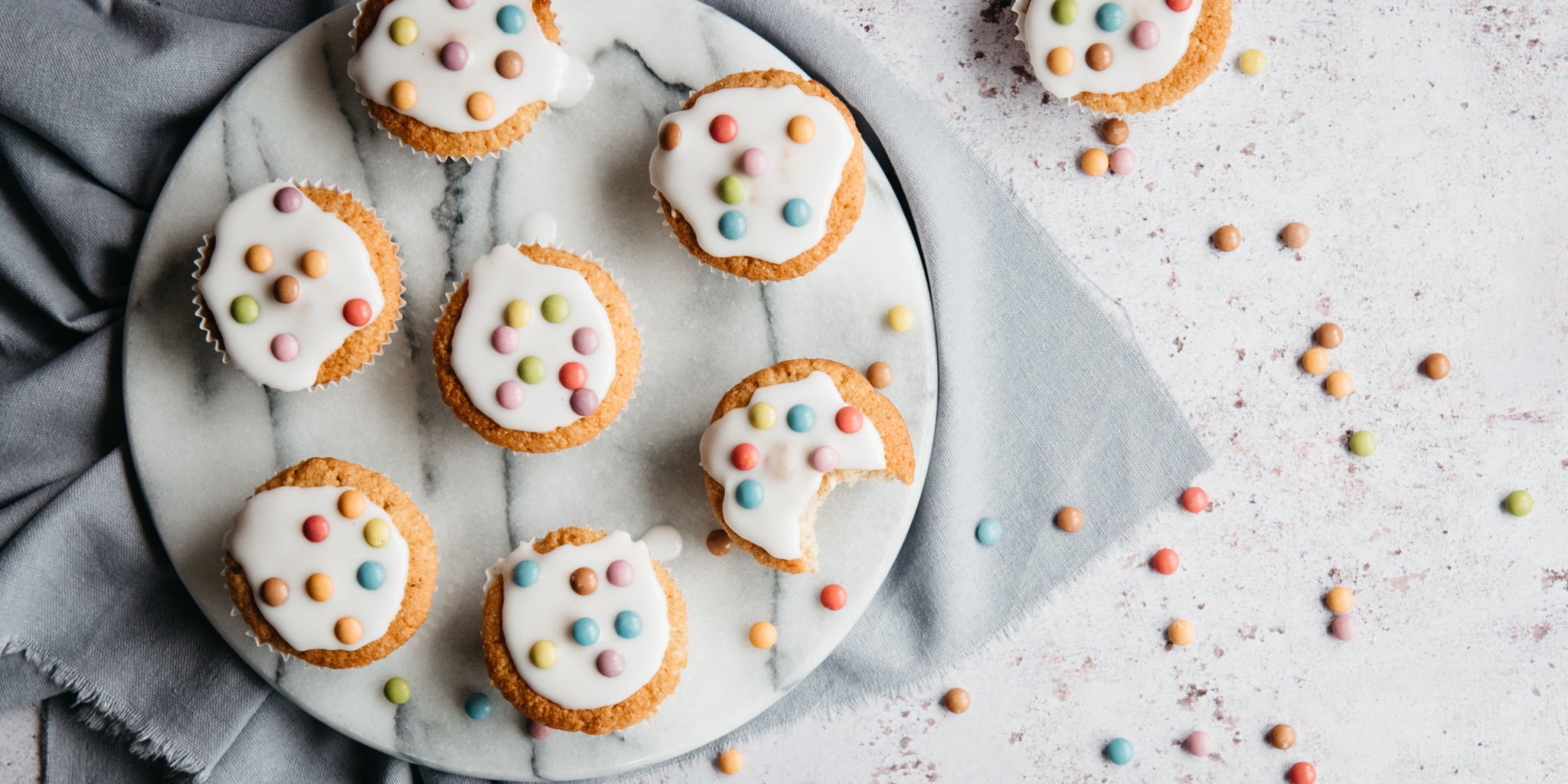 Spoon the icing on to each cake and decorate with a handful of coloured sprinkles.